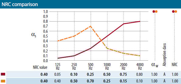 NRC (Noise Reduction Coefficient) blir beregnet i henhold til ASTM, og gir et tall på lydabsorpsjonen (høyere verdi er bedre). Det er det matematiske gjennomsnittet av de målte lydabsorpsjonskoeffisientene αs ved frekvensene 250, 500, 1000 og 200 Hz. Denne metoden gir jevn vekting over hele frekvensområdet, noe som betyr at den ikke er like nøyaktig som αw.